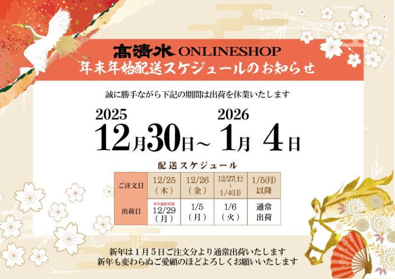出荷を休業させていただきます。2025年12月25日(木)までのご注文につきましては、年内出荷いたします。