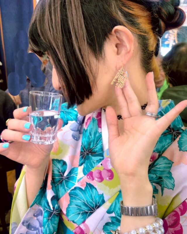 この日は仕事帰りの飲兵衛着付師・みねてぃちゃんと着物で待ち合わせ。2人でアンティーク着物系にしようと決めてました。私はアンティーク着物の柄を復刻した洗える着物です。煙がもうもうとしているかも~と思ったので一応対策を。でも店内特段煙たくなかったかも。コーデのポイントは猪口と徳利の帯留と、「酒」のピアスです♡みねてぃちゃんは可愛い絞りの着物にこってりアンティークの帯で可愛かったです。