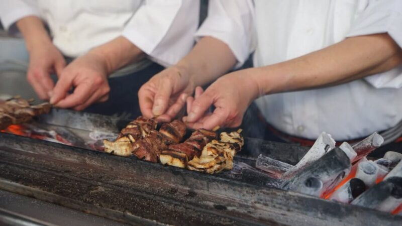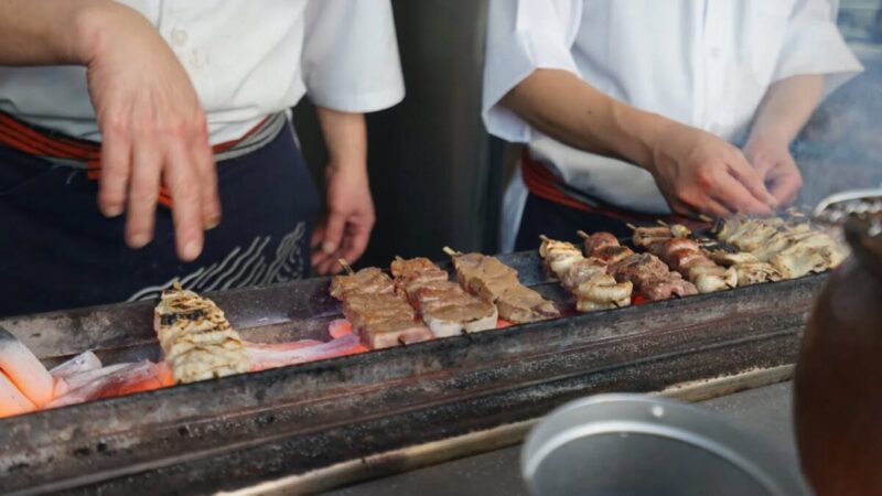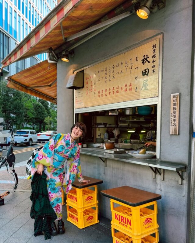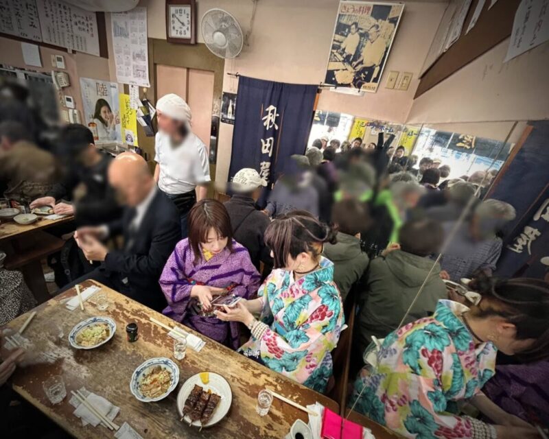 平日の午後3時半、早い時間なのにオープン待ちのお客様で長蛇の列のこちらは「秋田屋」さん。秋田出身としては絶対素通りできない店名です(創業者が秋田の人なんですって)。列には海外の方が少々とあとは常連さんなのか慣れた感じのお客様。お席は1階と2階で、あとはお外に、焼いているところを見ながら食べられる場所もありました。美味しそうな香りに誘われてお客さんが吸い寄せされていました。気持ちはわかる。入ってすぐに満席です!