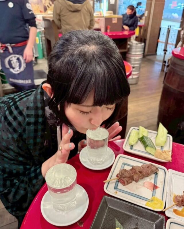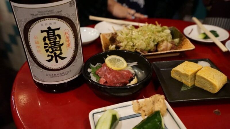 立ち飲みの時はついゆらゆらしてしまうので、手拭いは必須アイテムです。ここにも「高清水」の文字が。この手拭いは秋田県酒造組合「美酒王国秋田」オリジナルグッズで、日本酒を飲む時はいつも持参して秋田をアピールしています!!