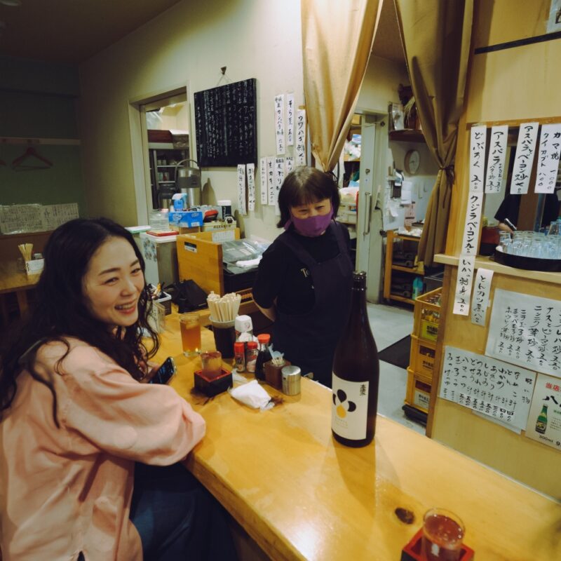 お隣の席では、ひとりで静かにお酒を楽しんでいた常連さんが。「週に一度は必ず来るんですよ」と笑顔で話してくれ、一緒に記念写真まで撮っていただきました。