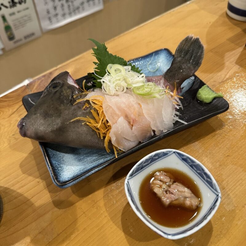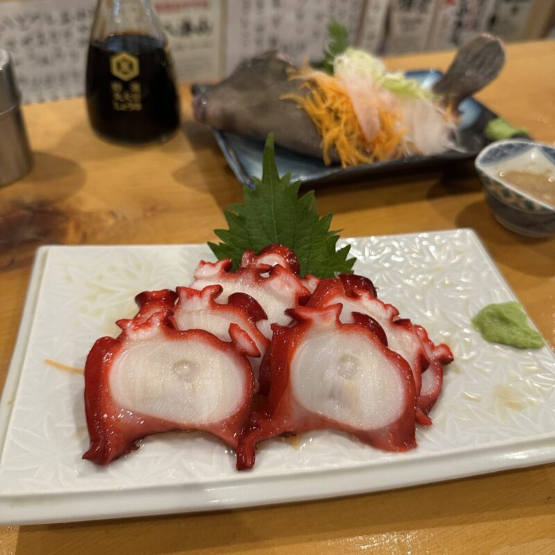 お酒を一口味わったあとは、お料理タイム。このお店の自慢は、市場で仕入れている新鮮な魚介類。そのなかから選んだのは、カツオのお刺身、カワハギのお刺身(肝しょうゆ付き)、そしてすだこ。